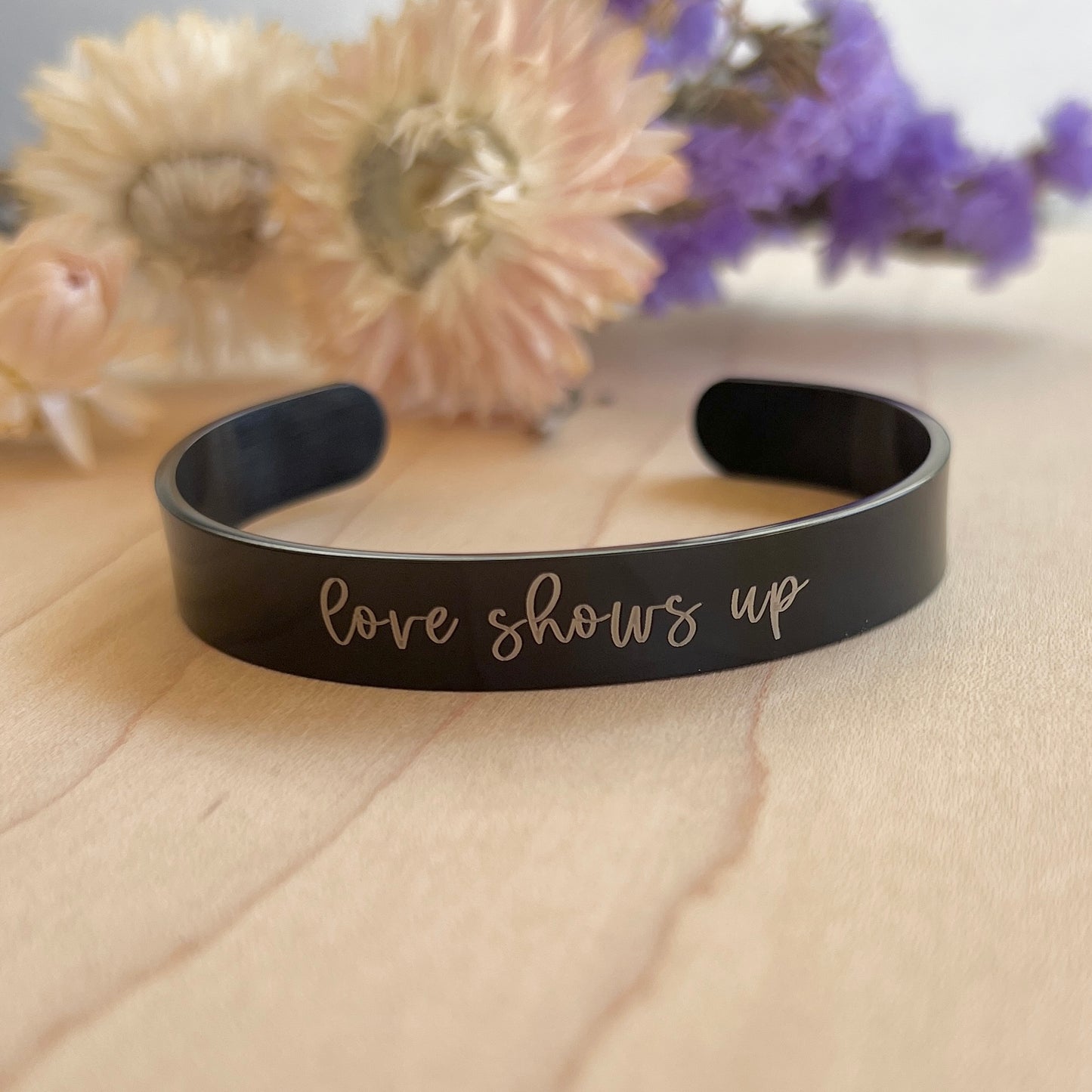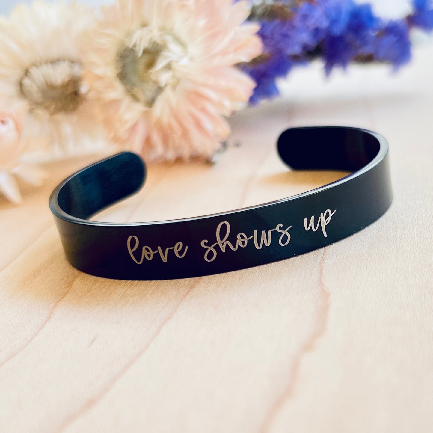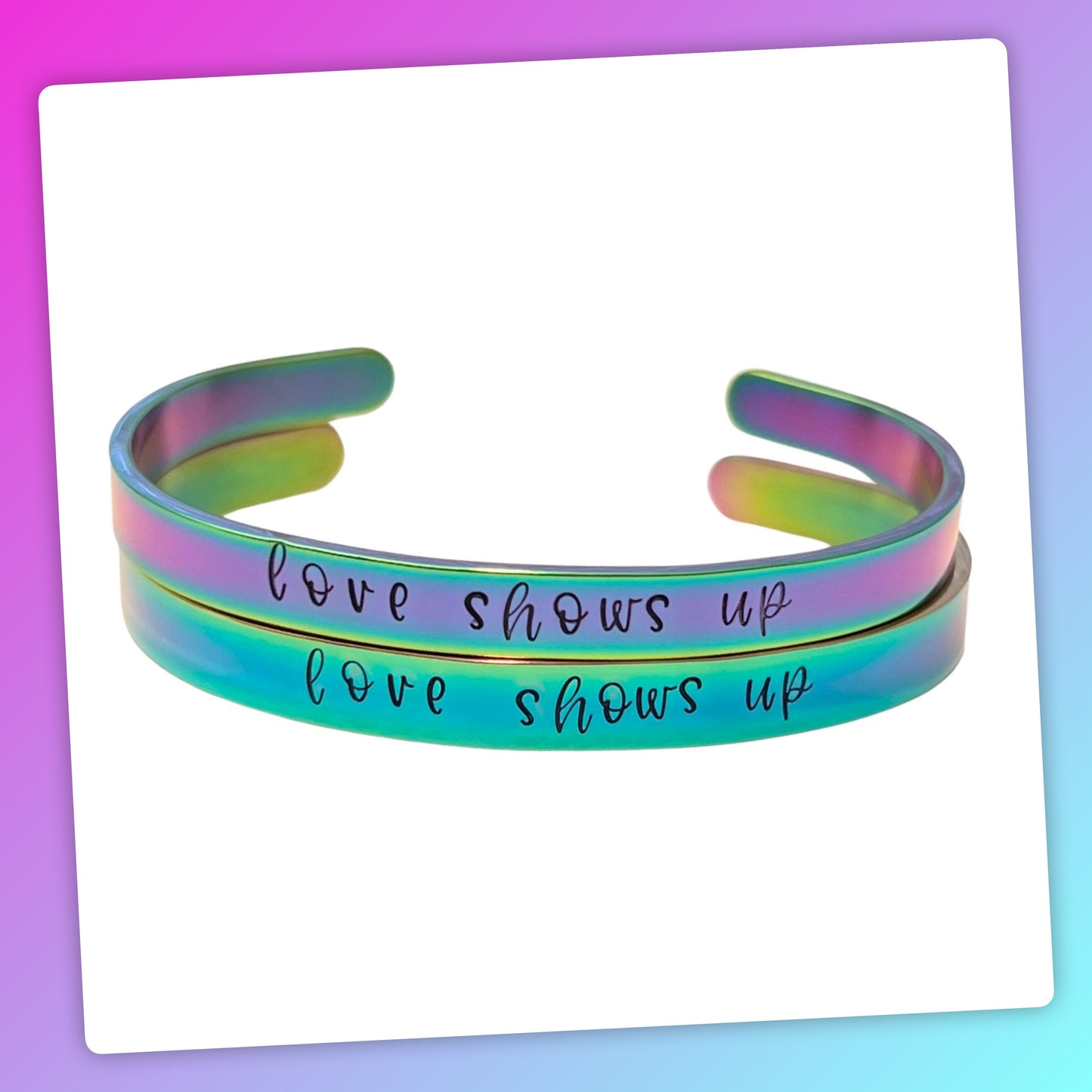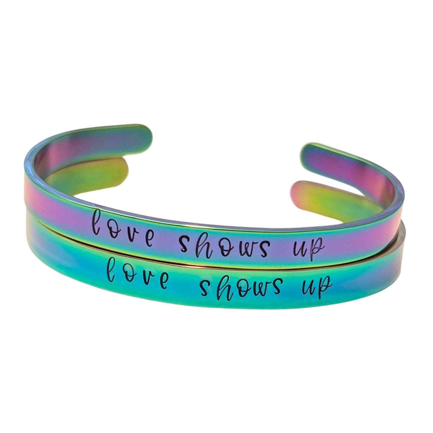 "Love shows up" ~ Abby Jimenez, Part of Your World. These stainless steel cuffs are sturdy, hypo-allergenic, and will not tarnish. They are 1/4” x 6” and can be worn with other bracelets.